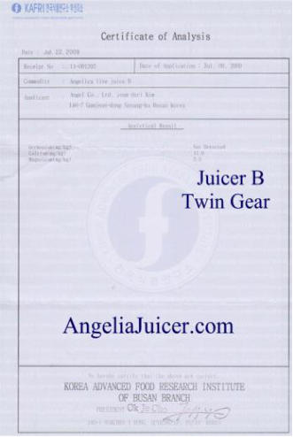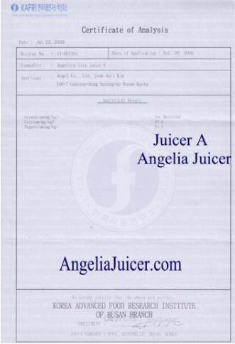 The test used the nutritional analysis on 500 mg of juice extracted using four leading juice machine: Juicer A: Angel Juicer Angelia 7500 juicer is the latest of the Angel/ super angel juicer models at the time of the testing: Calcium (82.8 mg/kg), Magnesium (15.0 mg/kg). View Certificate A. Notice a huge difference between our latest of the Angel/ super angel juicer machine compared to the nutrition extracted by our closest competitions as noted bellow. Notice that our competitors' nutritional content in the pulp thrown exceeded that what was extracted when compared to the nutrition extracted by the Angel juicer model Angelia 7500. Juicer B: Another twin gear juicer on the market: Calcium (11.9 mg/kg), Magnesium (5.5mg/kg). View Certificate B Juicer C: Single gear type juicer on the  market: Calcium (11.5 mg/kg), Magnesium (4.4 mg/kg). View Certificate C Juicer D: Centrifugal type juicer on the  market: Calcium (4.9 mg/kg), Magnesium (2.9mg/kg). View Certificate D